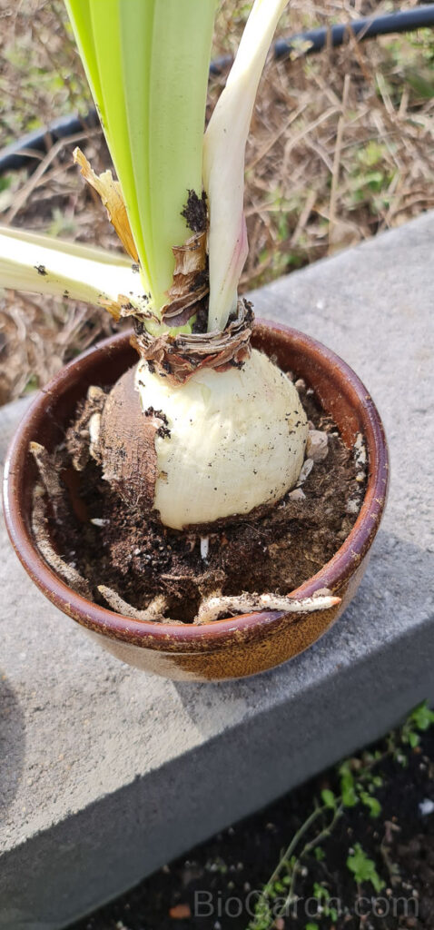 Отстранявам цветовете и оставям листата – те са тези, които ще фотосинтезират за големият лук, за да усвоят и превърнат слънчевата енергия в нови запаси. Почвата се поддържа леко влажна без да е прекалено, защото във вода луковиците са склонни да гният.